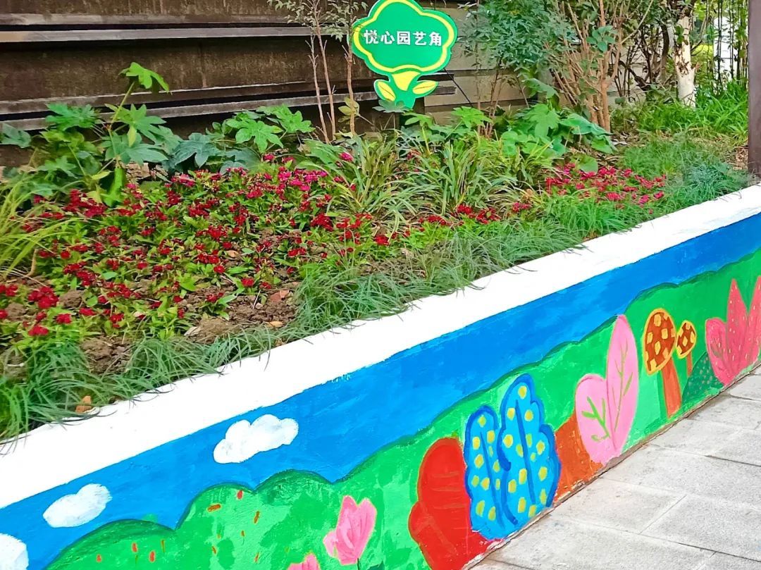 记者看到,悦心园艺角面积虽然不大,但在植物的选择与栽种上,却花了不少心思。十余种花卉绿植高低错落有致,虽是冬季也依然有鲜花盛开。花圃围墙的彩绘涂鸦也是由上海对外经贸大学的学生设计,并且带着社区里的儿童一起完成的。