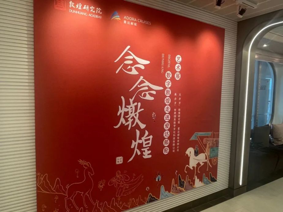 大讲堂所在的区域,同步地也在举办《念念敦煌:数字敦煌走进爱达邮轮》艺术展。“爱达·魔都号”的艺术画廊两侧的墙壁上展陈了由爱达邮轮和敦煌研究院精心挑选的16幅经典的敦煌壁画,包含了多个时期的佛教史迹画、本生故事画、经变画、装饰图案代表作。展览壁画借助了“数字敦煌”的数据支持,通过高保真复制技术实现了高精度的复刻,配合魔都号上休闲的旅游模式,观众可以在充足的时间里,自由欣赏远在千里之外的莫高窟壁画细节,在海洋上打卡敦煌瑰宝。