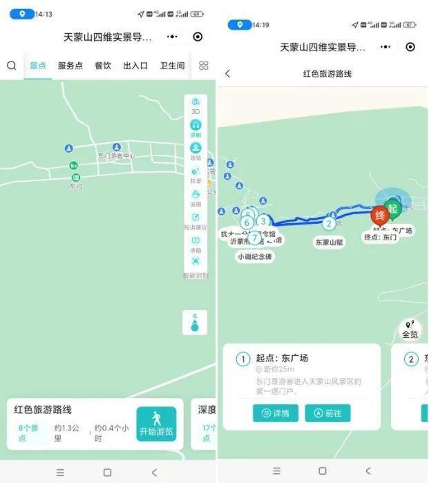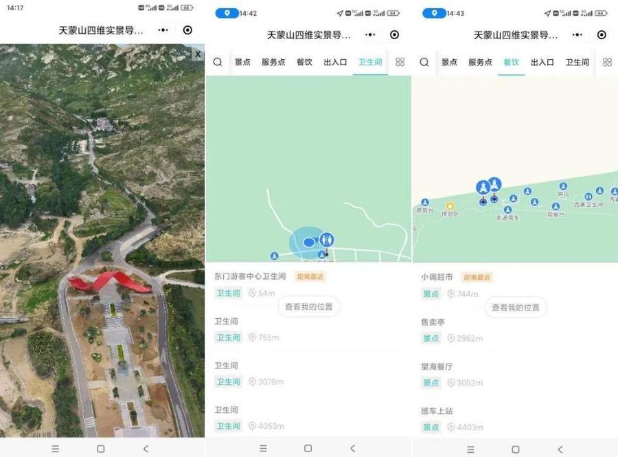 天蒙景区精准、矢量地图标注了各类型景点、服务点,推荐游览路线及旅游景点信息介绍,并能根据游客位置和兴趣爱好,定点、定向自动推送周围景点相关的知识点自动语音播报,还可以发送区域拥堵、紧急通知提醒。游客可以选定目的地,查看从当前位置到指定位置的导航线路。遇到危险时,游客还可通过微信小程序向景区管理系统发送紧急求助。