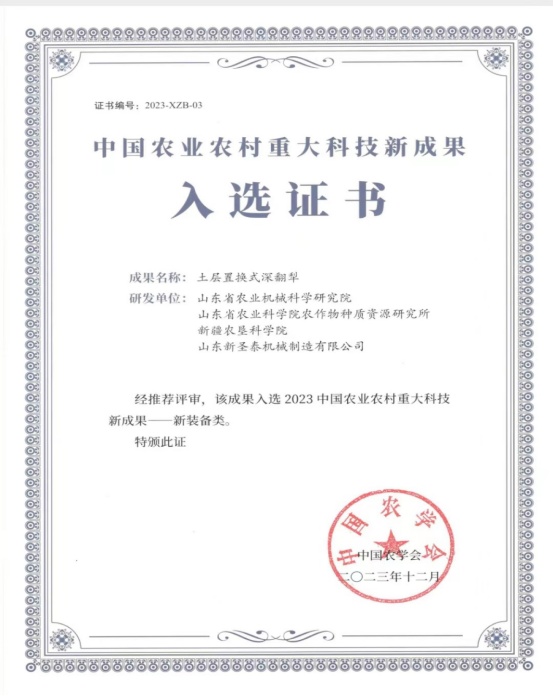 日前,《2023中国农业农村重大新技术新产品新装备》正式发布,山东新圣泰机械制造有限公司参与研发的土层置换式深翻犁入选十大新装备,受到科技界、产业界高度关注。这也是曲阜市推动院地合作取得的又一新成果。