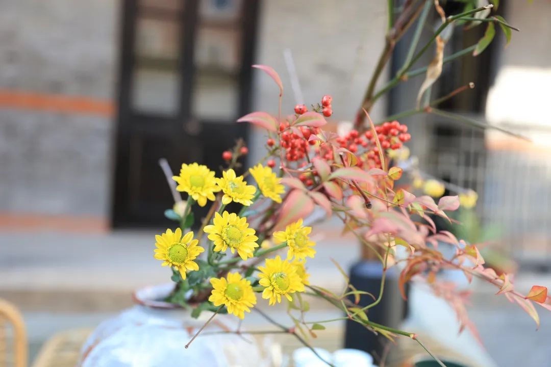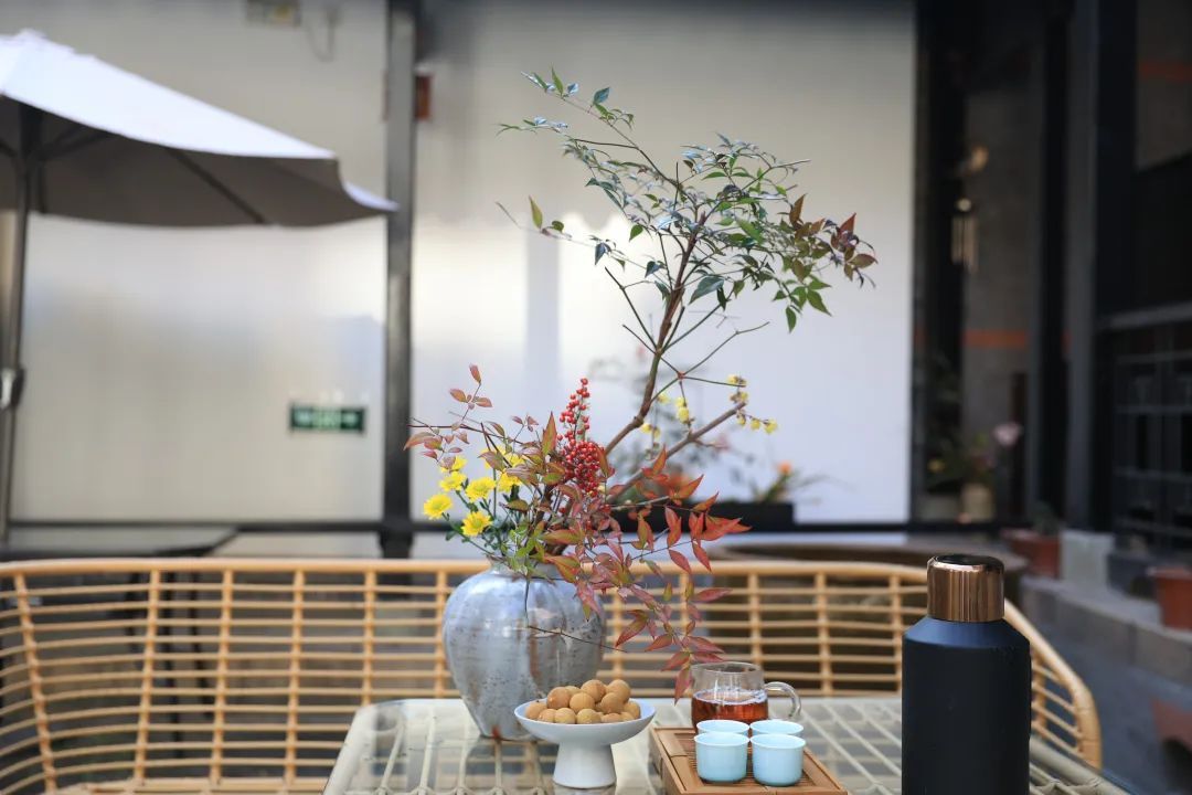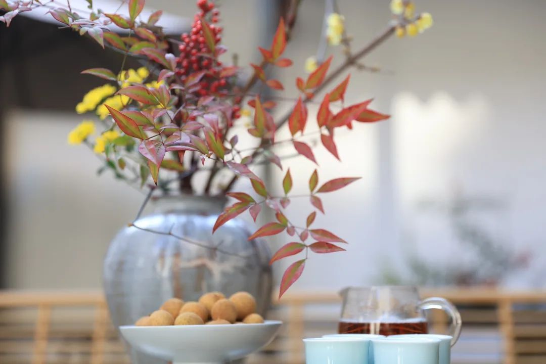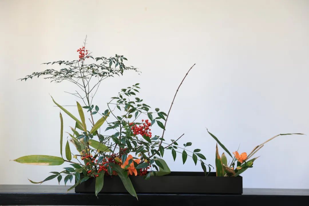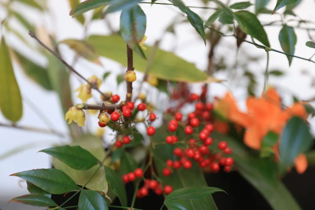 在冬日里,取几枝南天竹,可以为房间增添不少色彩之美。因为南天竹枝干造型优美,所以在插花过程中,可选择的容器比较多样,可以选择盆,也可以选择瓶,用南天竹的枝干打底,将红果子穿插其中,绿意盎然间,透露出红色的喜庆,营造出疏密结合、错落有致的形态。