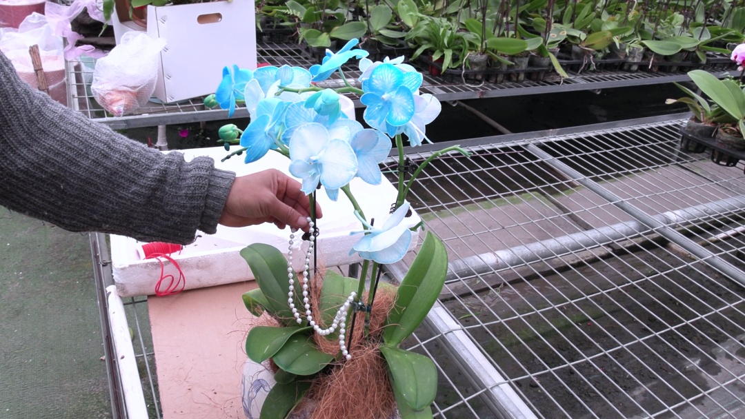 看惯了紫色、黄色的蝴蝶兰,是否看到过蓝色的蝴蝶兰?相比之下,蓝色的蝴蝶兰似乎多了一丝“仙气”。其实,这种蝴蝶兰的底色都是白色或其它比较淡的颜色,开花时使用染色剂浇灌,蝴蝶兰就会变色了,经常用的颜色可不止蓝色,还有橘色、青色。基地负责人陈松梅告诉记者,染色蝴蝶兰成了今年的畅销款,目前售价是普通蝴蝶兰的两倍,大约是60元一株。
