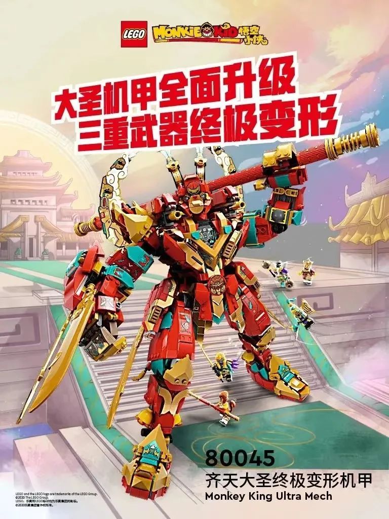而齐天大圣终极变形机甲,将经典猴王形象与现代化机甲进行结合,模型拥有丰富的细节和功能以增强玩乐体验:背部火箭推进器、火眼金睛神技(带有发光积木)、金箍棒以及可以转变为喷气式飞机的武器。