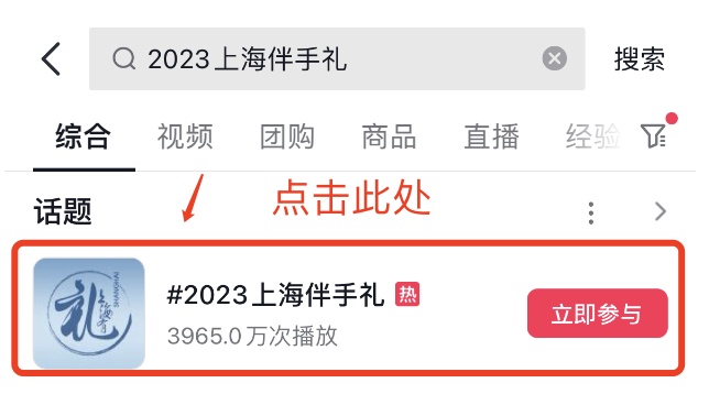 打开抖音APP搜索“2023上海伴手礼”,点击话题#2023上海伴手礼#;