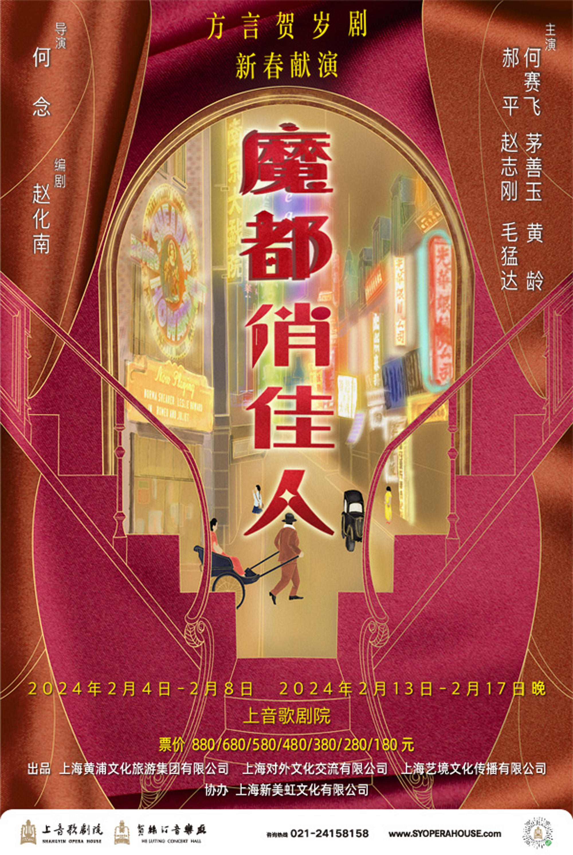 《魔都俏佳人》由何念导演执导,赵化南编剧,何赛飞、郝平、茅善玉、赵志刚、毛猛达领衔主演,黄龄特邀主演。该剧讲述了发生在上世纪三十年代上海药材行万老板(毛猛达 饰)的花园洋房里的故事。万老板是二婚,年轻妻子甘莎丽(黄龄 饰)的姑妈甘蔗阿嫂(何赛飞 饰)是黑社会人物,她做媒把侄女嫁进万家,就为图谋万家家产,但万老板是个精明生意人,不入这圈套。万老板的女儿万盈盈(茅善玉 饰)是个大学生,在与做慈善的青年欧阳明(赵志刚 饰)恋爱。甘蔗阿嫂用美人计不成,又生主意,给万盈盈做媒,叫年轻人孔白峰(郝平 饰)冒充财政部长孔祥熙的侄子,到万家相亲。在此过程中,发生了种种啼笑皆非的阴差阳错,加上各种方言的加持,整部剧充满了喜剧氛围,特别适合新春佳节期间,全家一同走进剧场欢欢喜喜过大年。