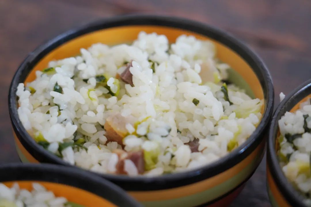 煮好的咸酸饭带着老灶台的柴火香,米粒充分吸收咸肉的油脂,猪油炒出来的上霜青菜香味四溢,再挑一块有锅巴的饭入口,混合了咸香、甜香和锅巴香的菜饭直接刺激着味蕾,无需其他配菜就能大口下肚,仿佛回到了小时候端着一碗温热的咸酸饭,坐在宅基门口边晒太阳边吃饭的时光。