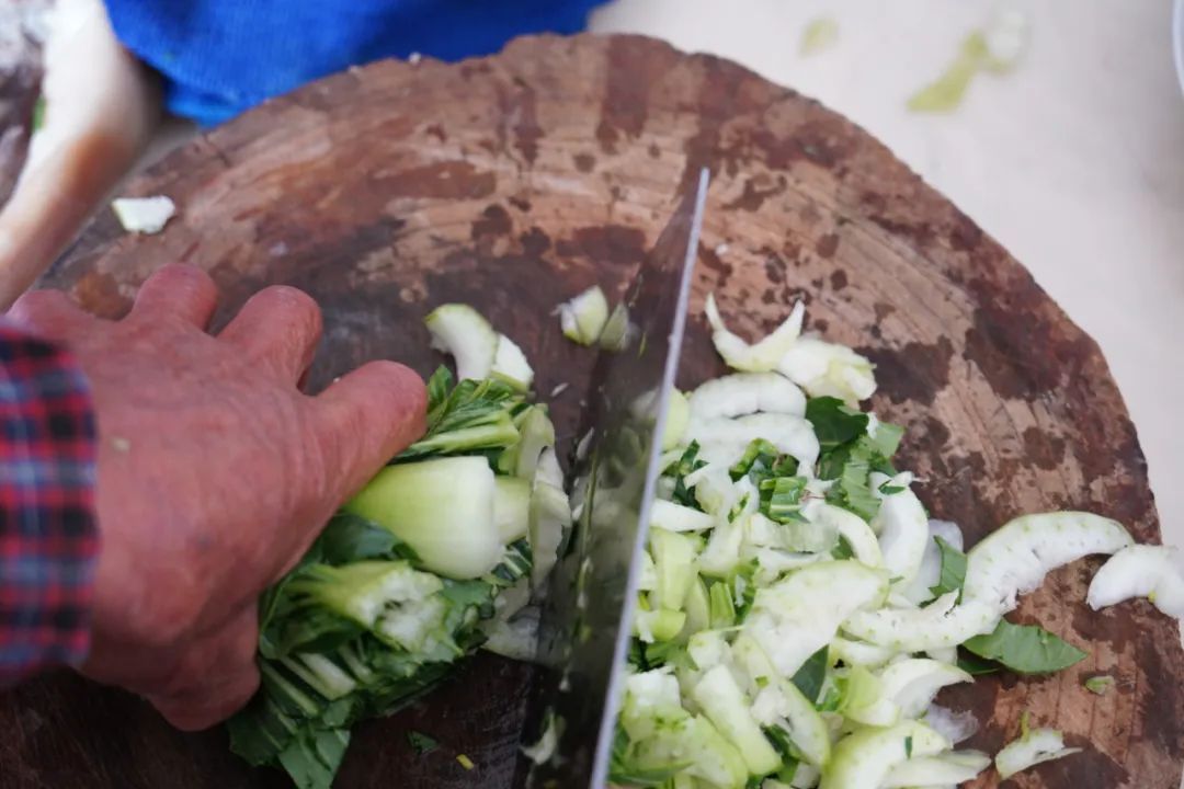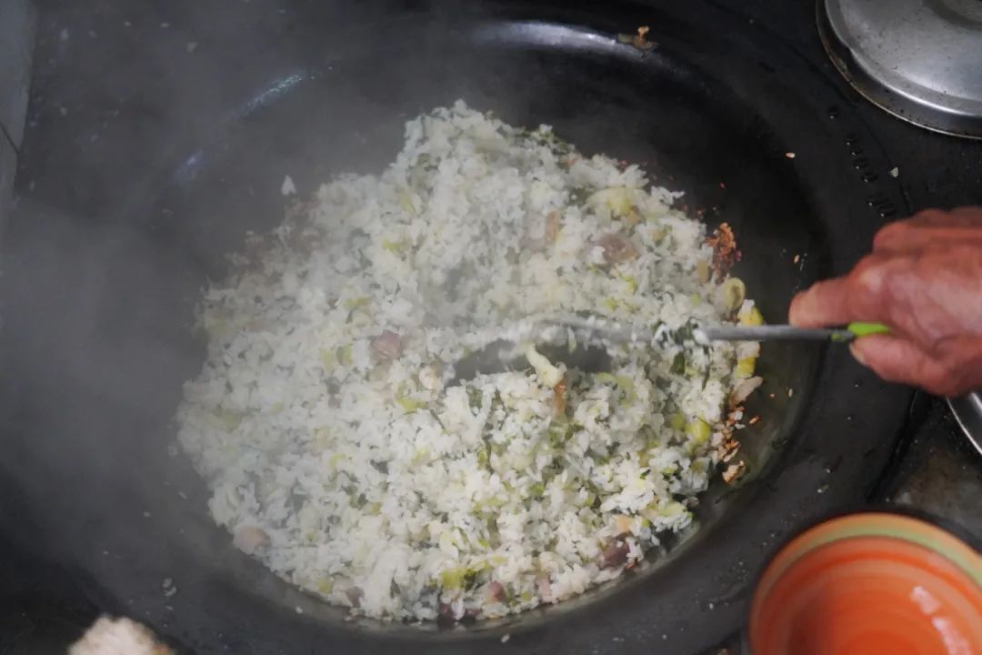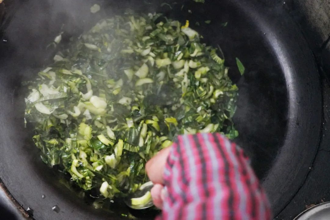 烧“咸酸饭”最好吃的肯定是土灶头。老袁说,没有灶头菜饭也不香了。等到灶膛内哔啵作响,热浪翻滚,老袁就往铁锅里放了两勺猪油,把事先切好的青菜放进去炒香,等到青菜炒软,再盛起来。