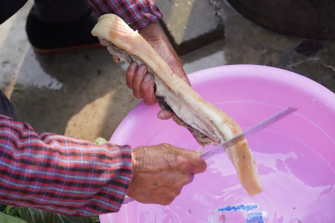 “小时候家里生活拮据,光吃肉菜吃不起,没什么东西吃的时候,老妈就会买一点点肉腌成咸肉,再切一点点肉丁,烧点菜饭吃,那个时候只觉得咸肉菜饭很好吃。” ——江海村村民袁国均