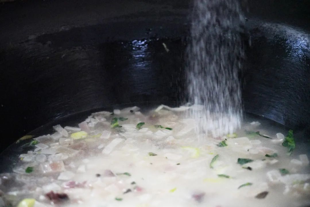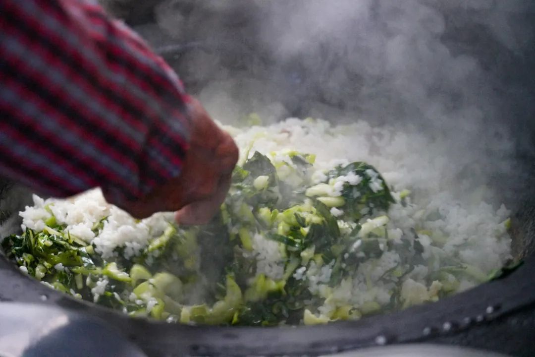 这个时候,烧到第一波沸腾,再把菜放进去搅匀,然后再烧。灶头的大火旺,通常只需要烧个一刻钟左右,差不多了之后再全部翻炒一遍,防止饭糍太厚。