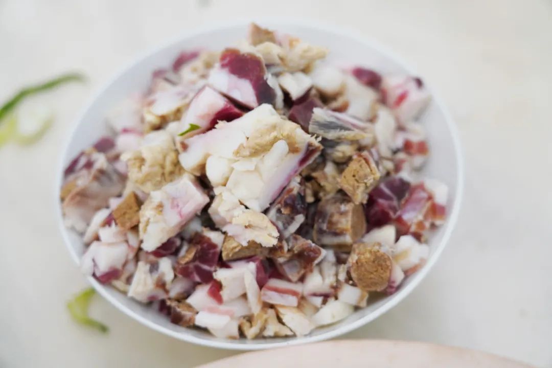 自家腌制的咸肉取下后,要初步洗净,去掉上面的浮油。咸肉最好是肥瘦相间的五花肉。洗了差不多之后再切丁,也要切小一点,这样的话菜饭烧起来咸肉也比较均匀。切好之后再用开水泡一泡,把咸肉表皮的油腻泡掉即可。