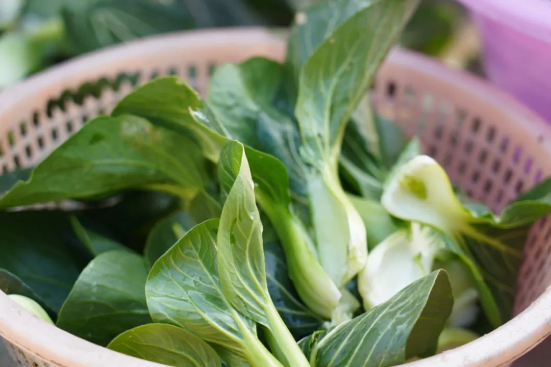 田里挑上几棵青菜,要先去掉老叶,挑选嫩一点的青菜叶放在水里洗干净。菜叶需洗两拨,洗完后,将青菜段切得细一点。