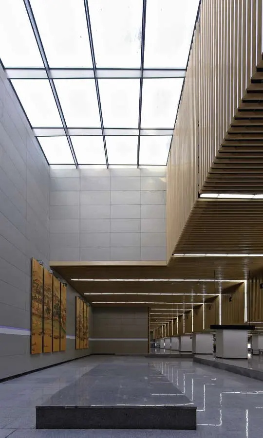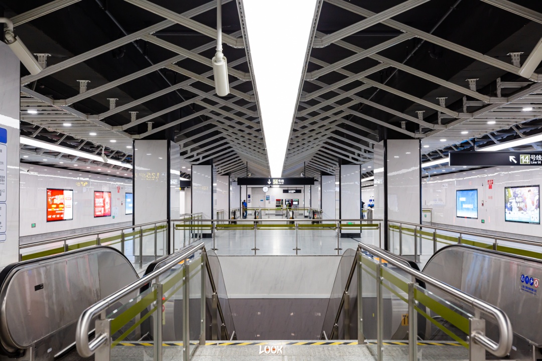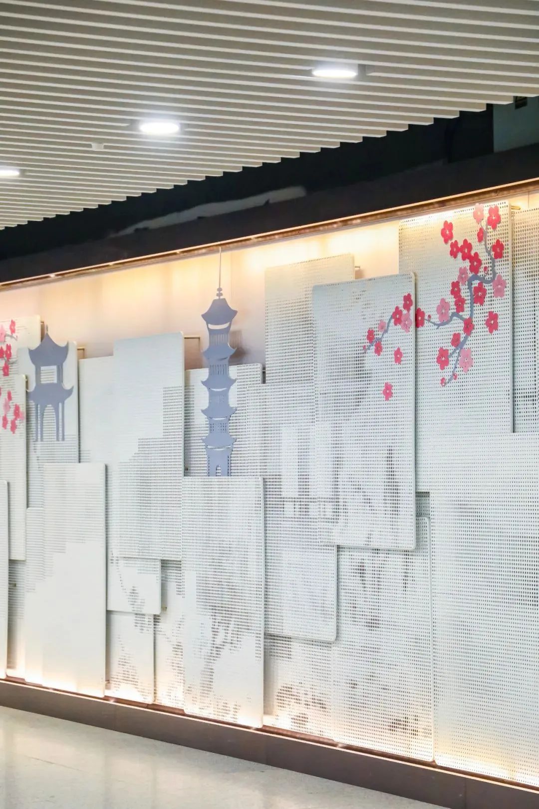 桂林公园站走的是文人画风,墙面折线的设计宛若古典园林中的屏风,一秒带你穿越悠悠古韵情境。站厅内的柱子横梁运用了中式窗格元素,尽显江南园林意境之美。