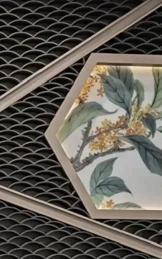 折面上装饰着桂林公园亭台楼阁的剪影,以及各种国画桂花、蝴蝶蜻蜓、词句书法等等,就连地面上,都有桂花的印记,可以说这设计十分贴合桂林公园的特色了。
