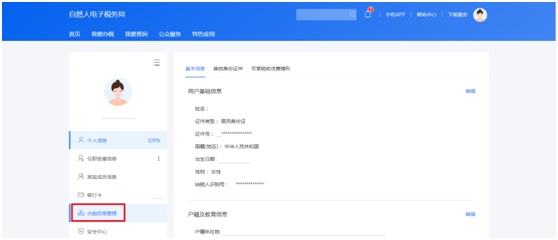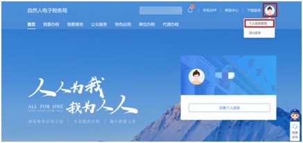 1.法定代表人或财务负责人登录自然人电子税务局网页端,点击右上角的小头像,选择“个人信息管理”。