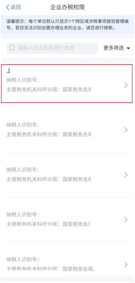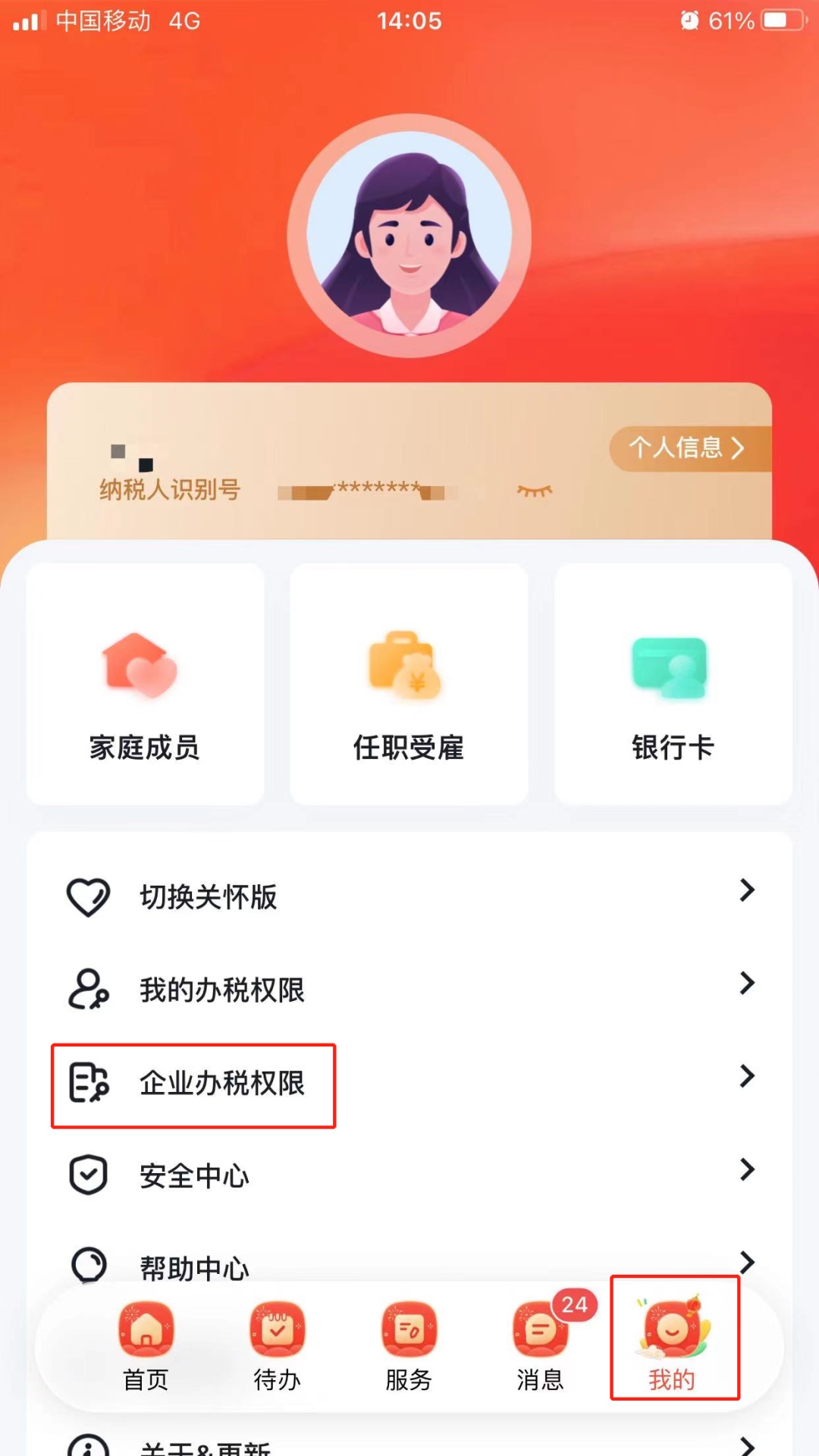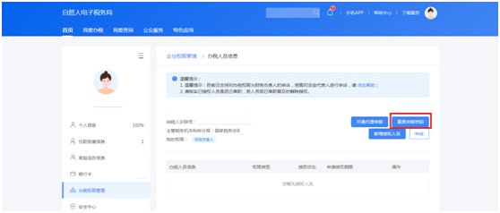 1.法定代表人或财务负责人登录个人所得税APP首页 ,点击“我的”,选择“企业办税权限”。