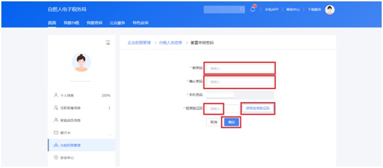 3.在右侧点击“重置申报密码”,在详情页中填写并确认新密码,点击“获取短信验证码”,填写收到的短信验证码,最后点击“确定”,密码重置就完成了。