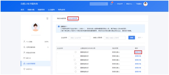 2.进入个人信息详情页,选择“办税权限管理”,点击“企业办税权限”,找到需要重置申报密码的企业,点击“查看详情”。