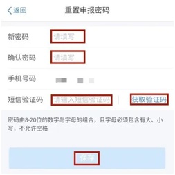 3.进入重置申报密码详情页,填写并确认新密码,点击“获取验证码”,填写收到的短信验证码,最后点击“保存”,密码重置就完成了。