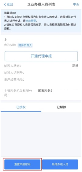 2.选择对应企业,进入企业办税人员列表详情页,在左下角点击“重置申报密码”。
