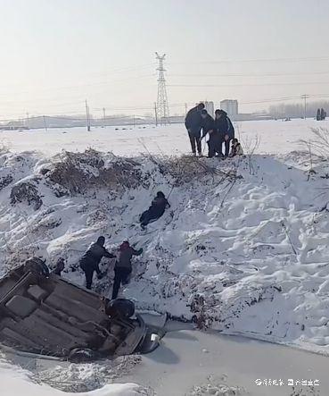 “不下雪的时候,这个石板坡我下去了都爬不上来。”任焕青和村民们对于此处情况十分了解,也更加明白帮助救人的重要性。恰巧过路的村民车上有条绳子,大家拿了绳子,绕到有车门露出的渠对面,此时车内一名被困人员的家属赶到现场后爬下坡站到了冰面上,李士同也拉着绳子站在了半坡上,绳子系在门把手上,大家一起合力拽,想赶紧打开车门救人。