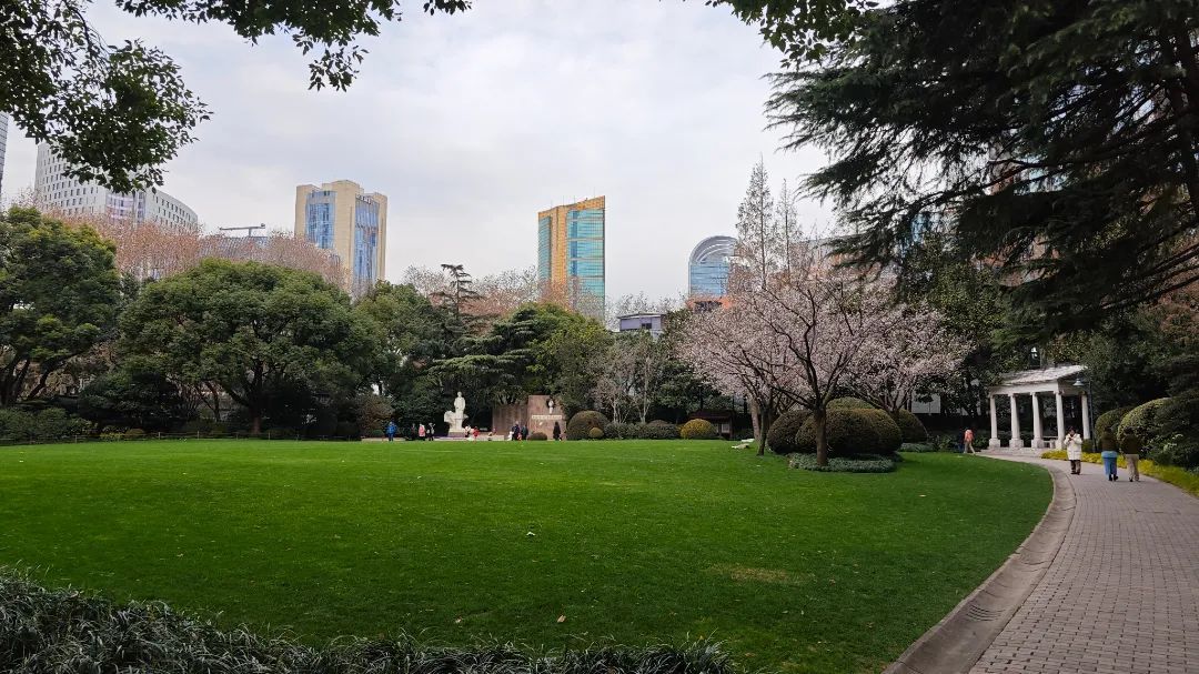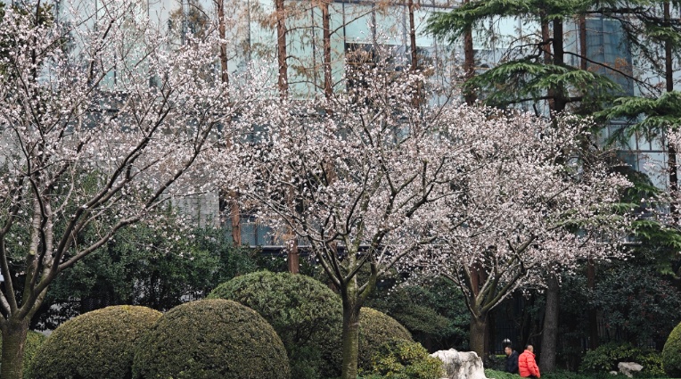 近日,静安公园内的6株大樱花相继盛放,为公园带来了今年第一场缤纷花舞。