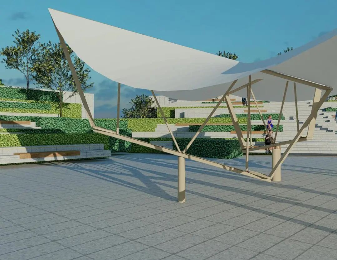 此次一等奖由戴钰惠、何佳怡摘得。该设计作品兼具实用和美观。设计以法式草坪文化为切入点,将闻名全世界的“可颂”面包作为灵感来源,将景观符号置入草坪,膜结构感官轻盈、雕塑感强,其大体量和亮黄色外表也将拉近与市民游客的距离,为城区注入融合共生的“暖意”。