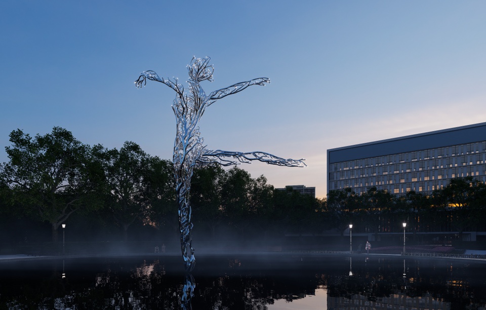 同获二等奖的还有王海清的《生•融之舞》。藤蔓上点缀着璀璨的灯光,造型犹如一个芭蕾舞者,在水池中翩翩起舞。“海纳百川,兼容并蓄”的海派文化,在作品中得以展现。