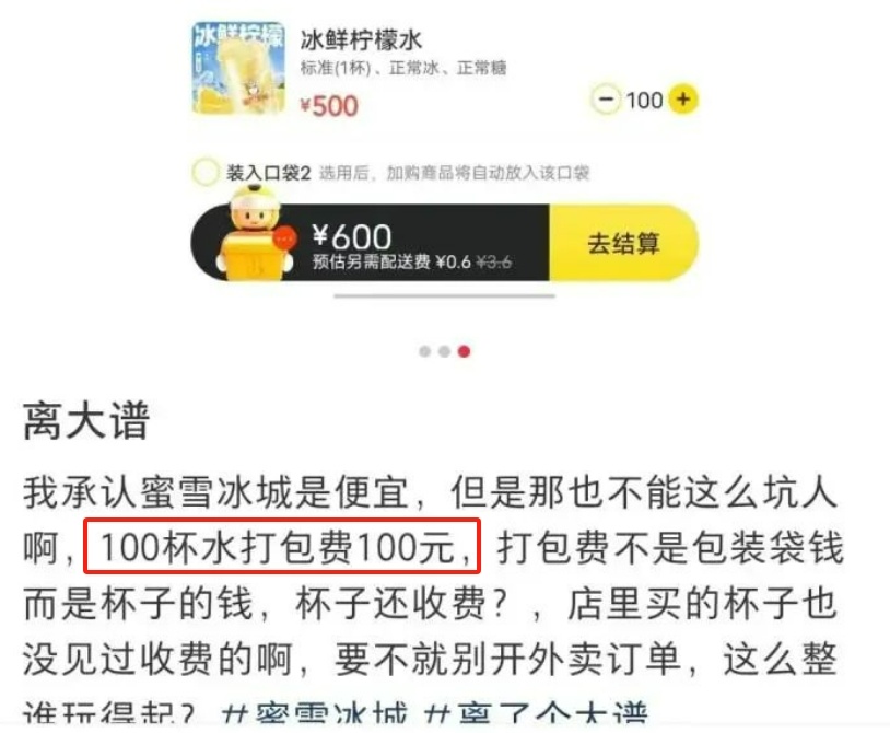 还有网友吐槽,我要是点个100杯蜜雪冰城,按照1元一杯打包费,就要额外付100元,相当于20杯柠檬水了,而商家又不给我100个袋子,这合理吗?