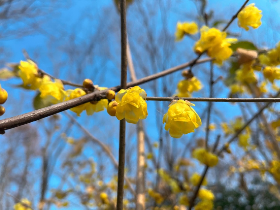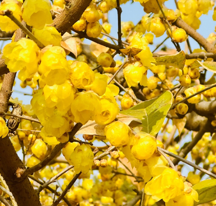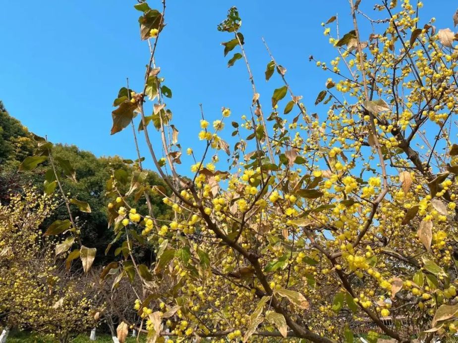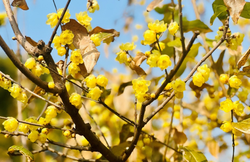 由于入冬以来,低温天气较少,导致蜡梅树上的老叶还未掉完,花苞却已经逐渐盛开了,目前公园内的蜡梅呈现花叶同枝的现象。