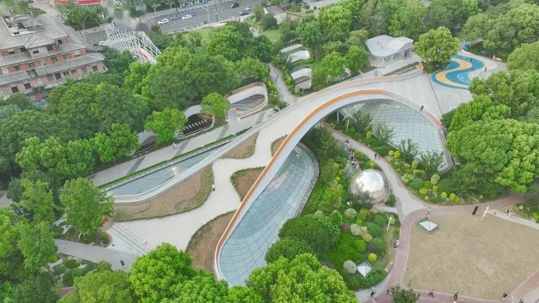 “彩虹桥”一直是北外滩滨江绿地的一处特色景观建筑,从上空往下看,它呈现出一只蝴蝶的造型。