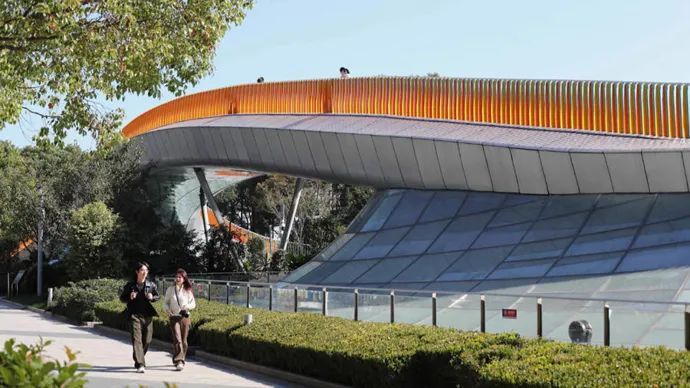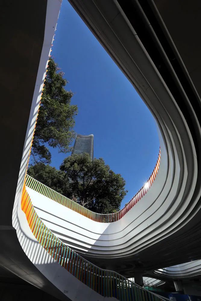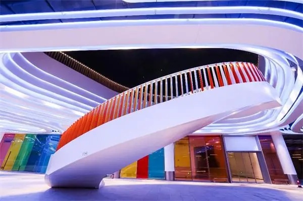 行走在“彩虹桥”上,两旁的扶手格栅,包含有绿、蓝、红、橙黄及白色五种颜色的铝板,通过规律的排列组合,实现色彩的动态视觉效果。