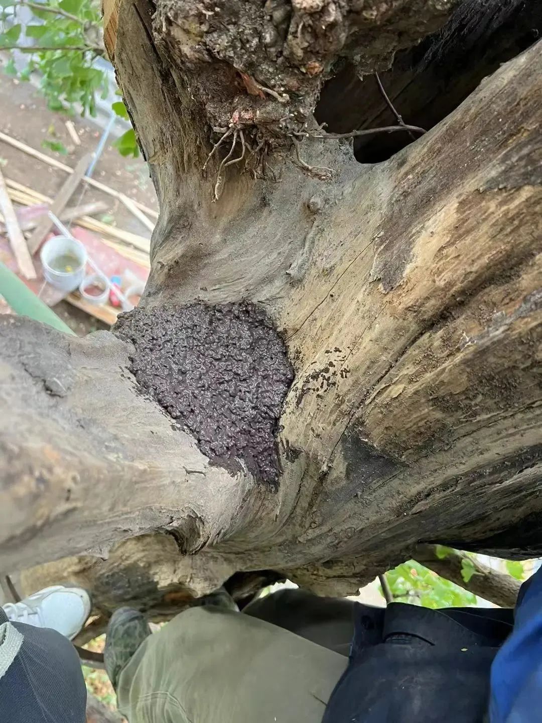 对于古树中的树洞,专业人员根据不同树洞位置,采用专业定制工具对树洞内部的腐烂物进行逐步清除,再用吸尘机清除腐烂垃圾,打磨后做好杀虫杀菌并灌注防腐剂。朝天树洞则填充实体材料,实体材料采用高强度粘合剂混拌骨材,待其固化后使用伤口愈合剂进行封堵。
