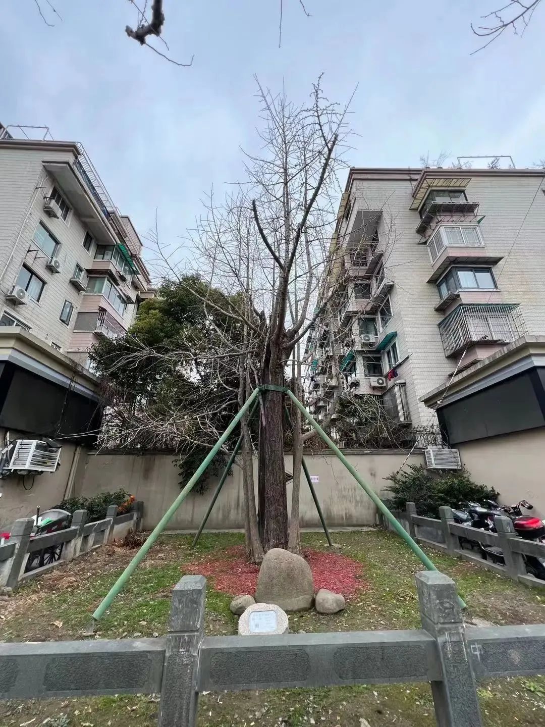 专业检测机构也对土壤取样分析,并根据检测报告进行土壤改良。为防止电动车乱摆放影响古树,古树树坛两侧加宽至与商铺门面对齐,与原有两侧角落花坛整体连接,外侧围边安装水泥高仿木栏杆。背景墙为彩绘水墨山水画,题写银杏主题古诗,营造中式园林意境。