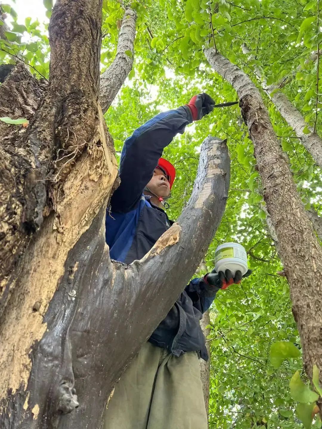 首先,专业人员对过密枝、重叠枝、枯损枝和病虫枝进行了修剪,将树枝截除至适当位置,平整切口并进行消毒,待风干后涂抹伤口愈合剂。