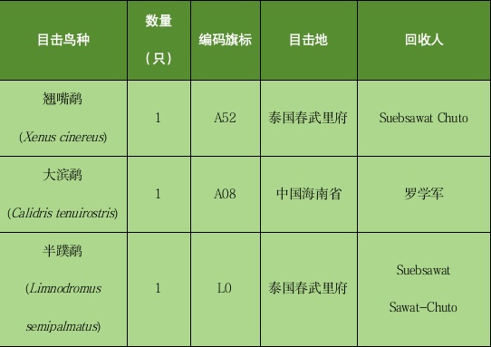 在全世界鸟友们的热心反馈下,2023年12月,东滩保护区管理事务中心共收到3种3只次水鸟的目击回收记录,分别回收于中国海南省和泰国春武里府。具体情况如下:翘嘴鹬1只(泰国春武里府);大滨鹬1只(中国海南省);半蹼鹬1只(泰国春武里府)。
