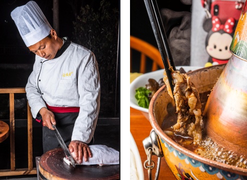 夹满一盘手工现切热气羊肉,浇上一勺锅底,汤汁的咸香慢慢渗入羊肉中,每吃一口都够味儿,重要的是羊肉都是吃一份、切一份。新鲜的羔羊后腿肉,保证了羊肉的品质。