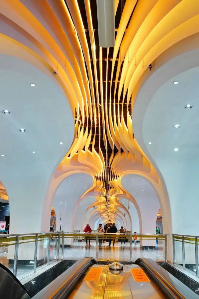 豫园站的站厅设计名为《上海脉搏》,设计师从黄浦江的水流形态中获得灵感,将曲线线条像江水一样自然拍打到柱体上,形成有韵律感的脉动。用水的形式语言,一气呵成地塑造了古典、东方、现代的空间体验。