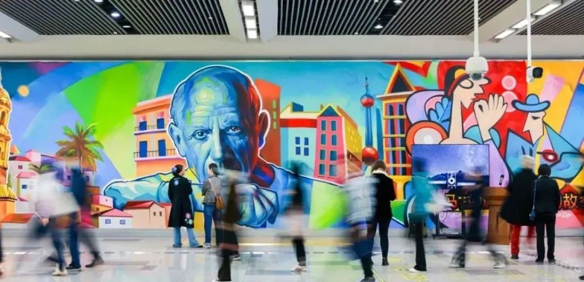 如今,在龙阳路站还可以看到一幅令人惊叹的14x4米大型西班牙墙绘。这幅作品生动地展示了毕加索的家乡马拉加市和上海市的地标景观,同时融入了向毕加索致敬的元素。