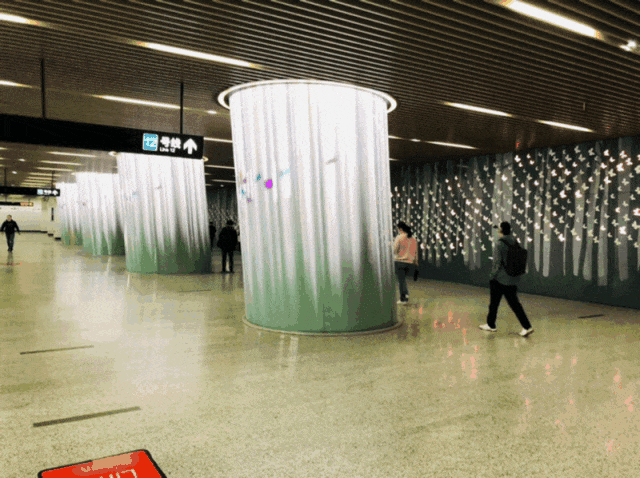 1号线与12号线汉中路换乘的通道里,数千只彩色蝴蝶构成了梦幻的“蝴蝶墙”,该设计以“庄周梦蝶”的典故为灵感,墙面上有2015只彩色蝴蝶,灯光变换的时候,不断闪现跳跃仿佛翩翩起舞,让人仿佛置身于童话。