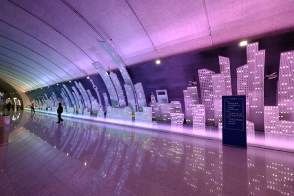 设计师在15号线的地铁站站厅设计上做了创新,净跨达到21.6米的预制大跨叠合拱型结构让整个站厅显得空旷而深邃,两侧长达70米的LED灯带则动感地呈现了浦江天际线。