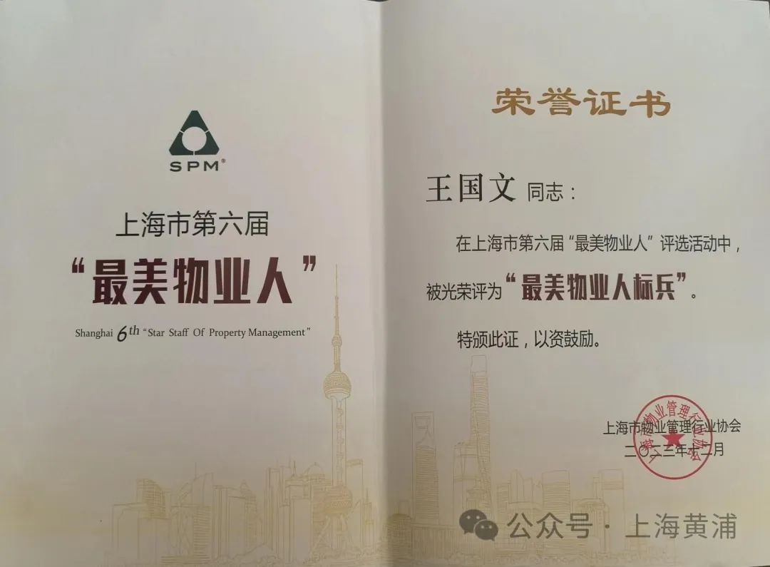 近日,在由上海市建设交通党委主办的“深化党建引领住宅小区管执联动工作推进会暨2023年度上海市物业管理行业职业技能竞赛、第六届‘最美物业人’评选活动总结交流会”上,金外滩集团所属应急中心维修队长王国文荣获了上海市第六届“最美物业人标兵”称号,成为上海市物业行业100名“最美物业人”中的10名“标兵”之一。他也是去年黄浦区属国企中唯一一名“最美物业人标兵”。