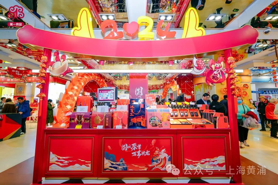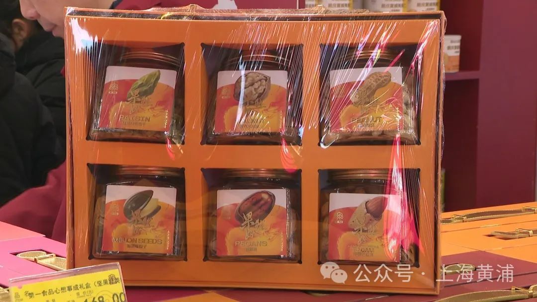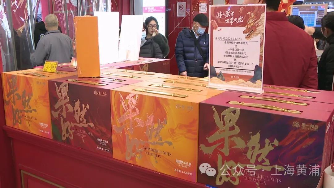 记者在现场看到,各种龙的造型和装饰让商场充满了喜庆的色彩和浓浓的年味。商场内人头攒动,各种年货礼盒都摆放在了显眼的位置,受到了不少消费者的青睐。像这款坚果礼盒,里面含有手剥巴旦木、碧根果等六种销量不错的坚果,经济实惠。而这款新春年菜礼盒,包含了目鱼大烤、苔条花生、八宝鸭、全家福砂锅和八宝饭等从冷菜、热菜到点心,都是上海经典特色品种。