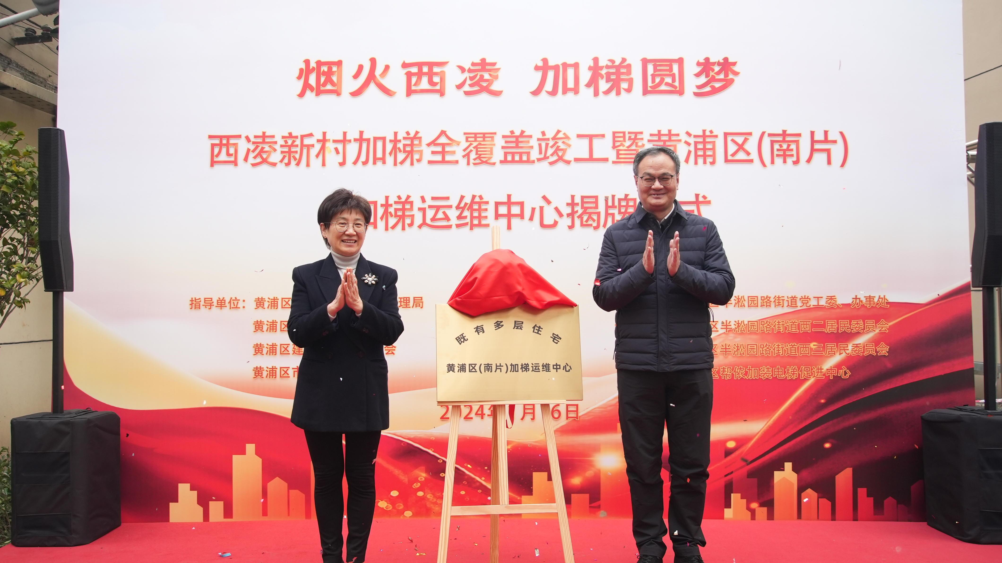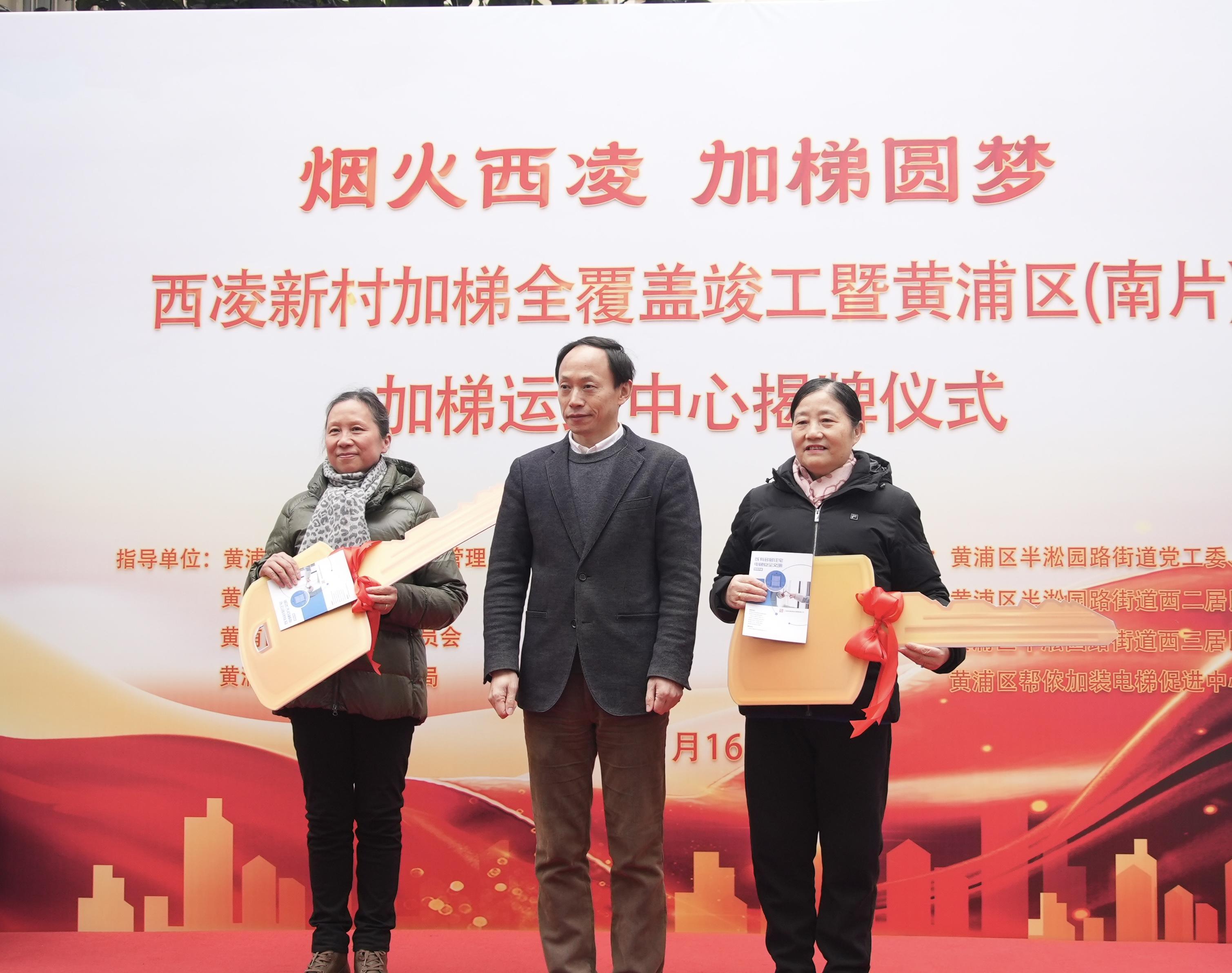 1月16日下午,西凌新村加装电梯全覆盖竣工暨黄浦区(南片)加装电梯运维中心揭牌仪式举行。市房管局党组书记、局长王桢,区人大常委会副主任张芹为黄浦区(南片)加装电梯运维中心揭牌。区政协副主席张正明向居民赠送电梯钥匙和安全使用电梯手册。