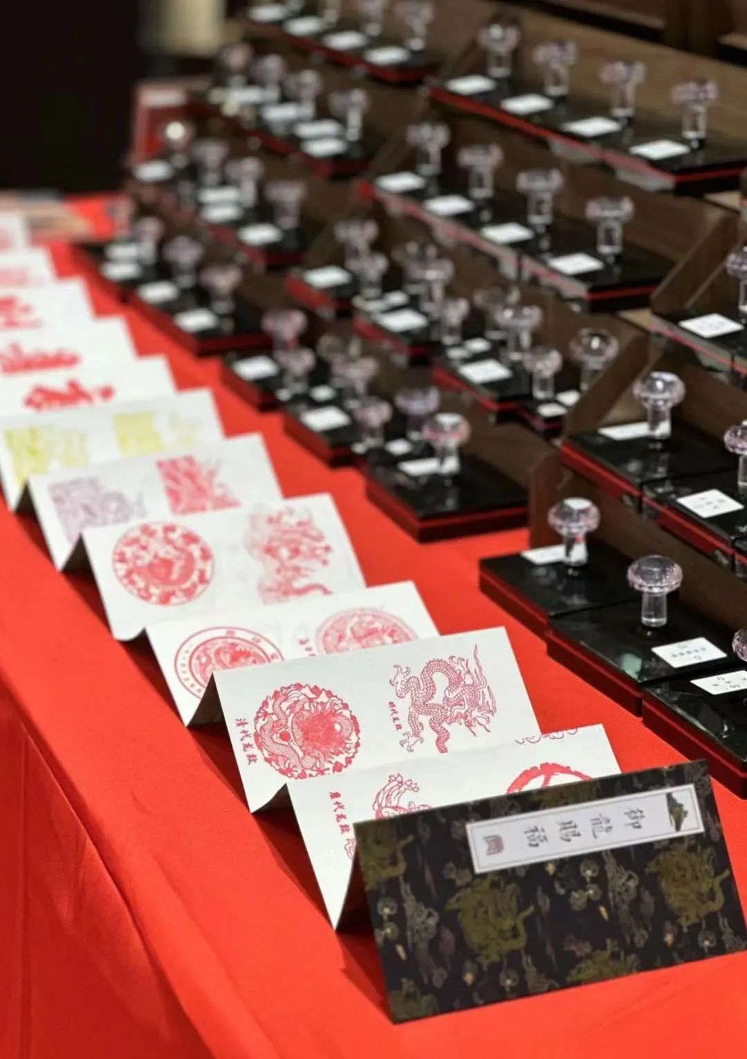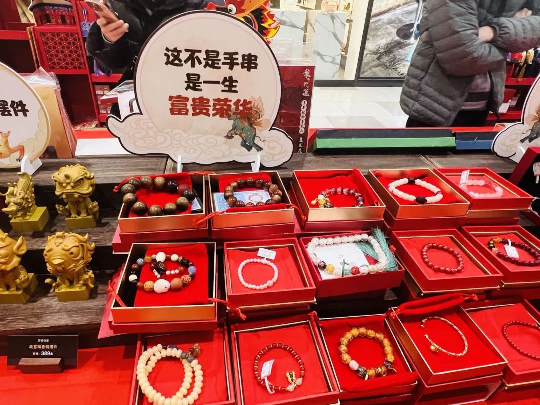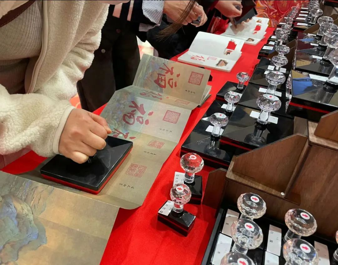 现场盖满56枚印章,参与互动打卡,拍照发布小红书笔记并@上新了故宫快闪店,即可免费领取一条“龙年朱砂红”。