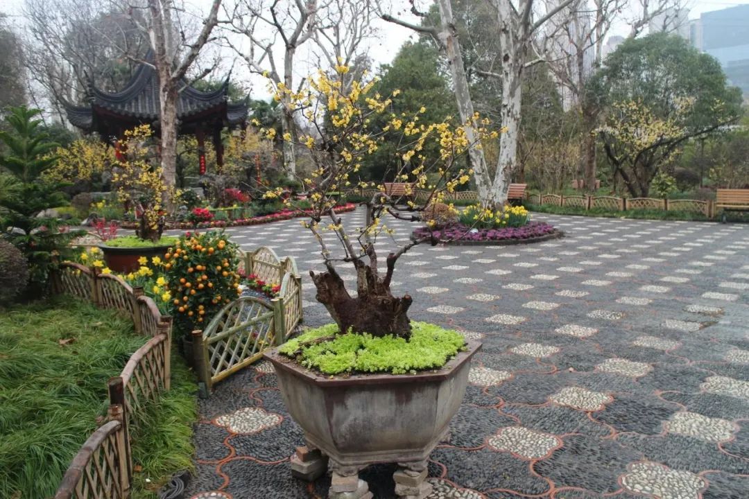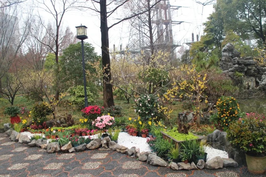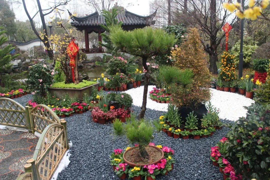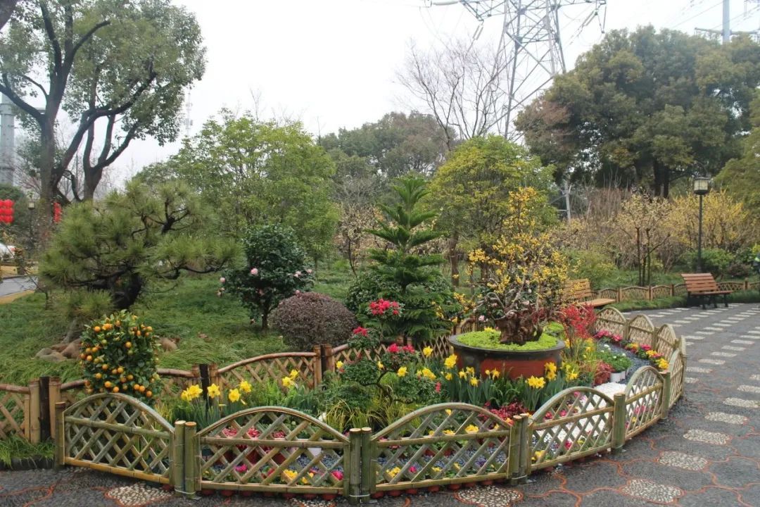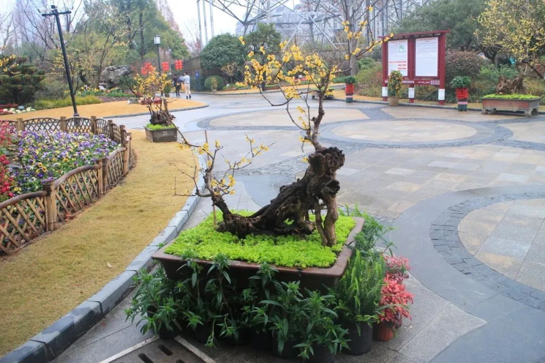 以怡然自得的田园生活主题为中心,竹篱围边辅以各式造型的蜡梅盆景、郁金香、报春花以及时令花卉,为悬铃木广场营造出灵动、活泼、繁花似锦的景象与氛围。