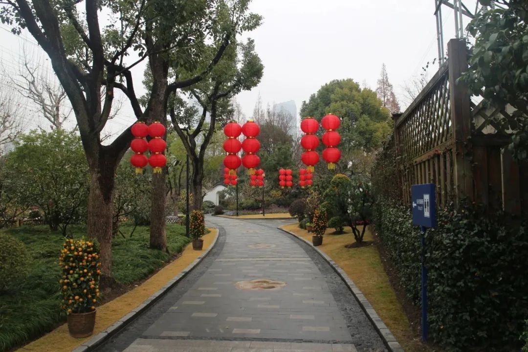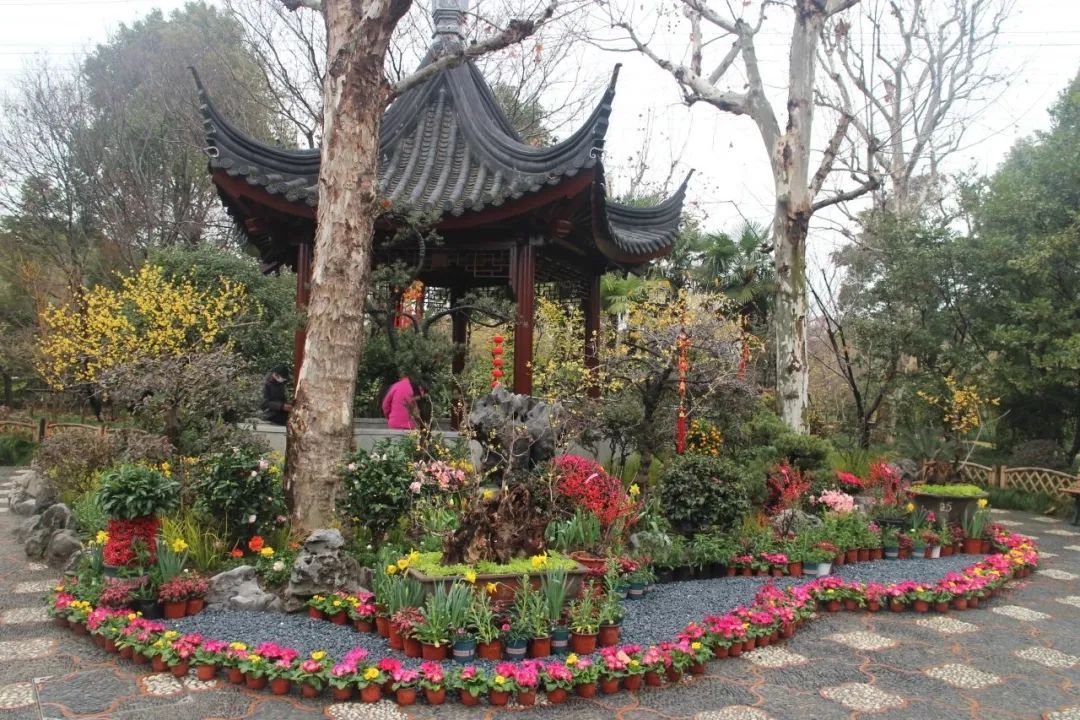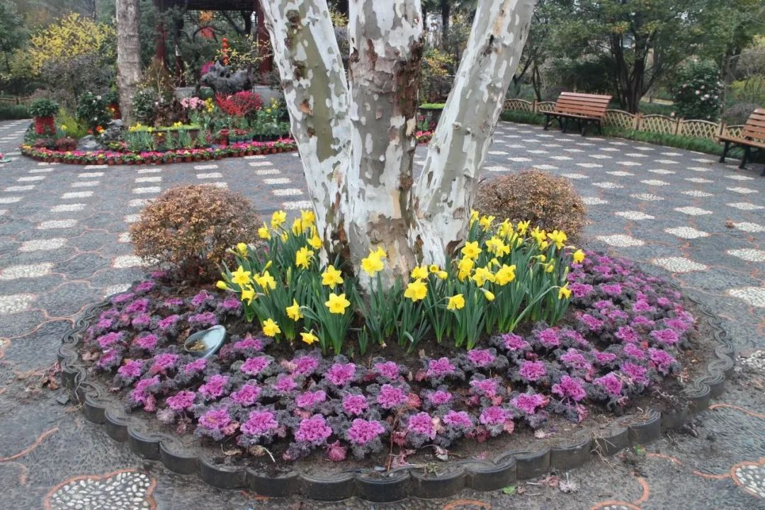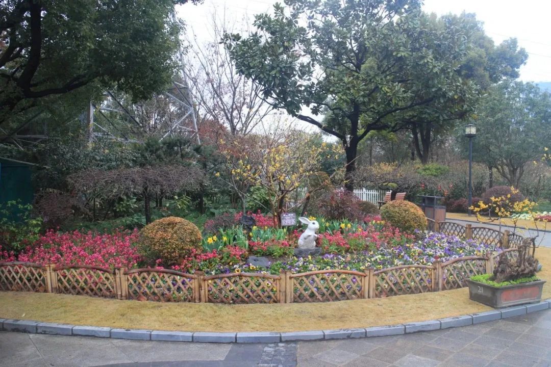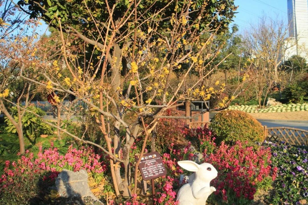 以怡然自得的田园生活主题为中心,竹篱围边辅以各式造型的蜡梅盆景、郁金香、报春花以及时令花卉,为悬铃木广场营造出灵动、活泼、繁花似锦的景象与氛围。