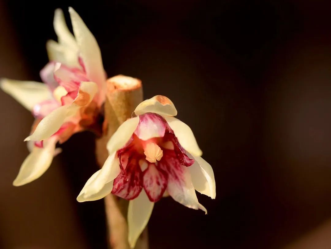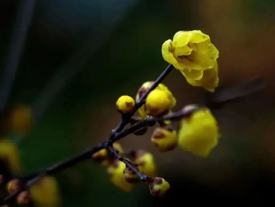 蜡梅是蜡梅科属灌木植物,李时珍的《本草纲目》记载“此物本非梅类,因其与梅同时,香又相近,色似蜜蜡,故得此名”。蜡梅凌寒开放、飘香如故,暗喻了自己坚贞不屈的文人傲骨以及不向世俗献媚的高尚情操。