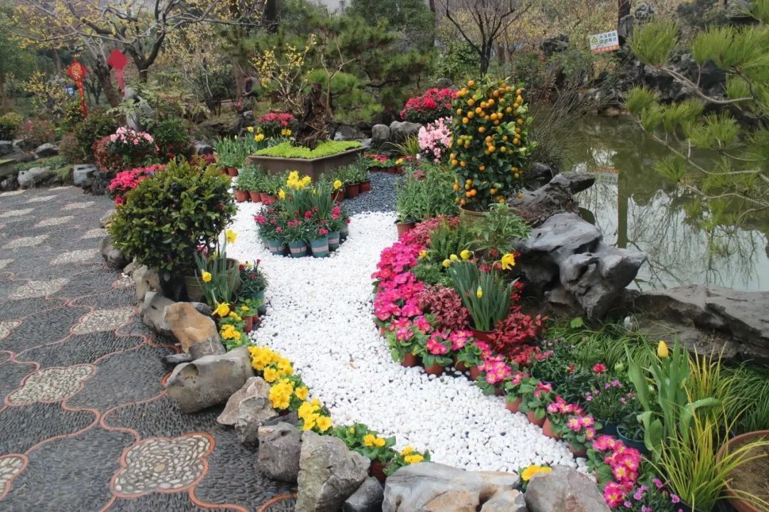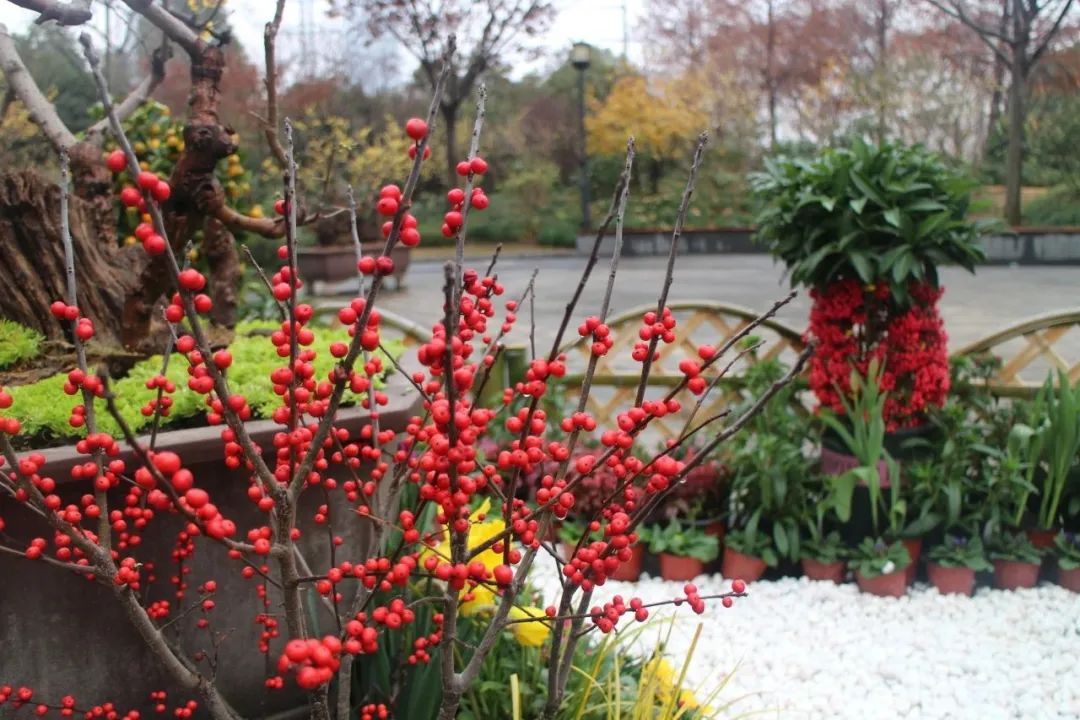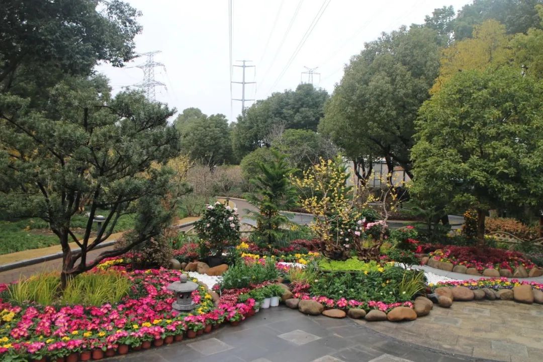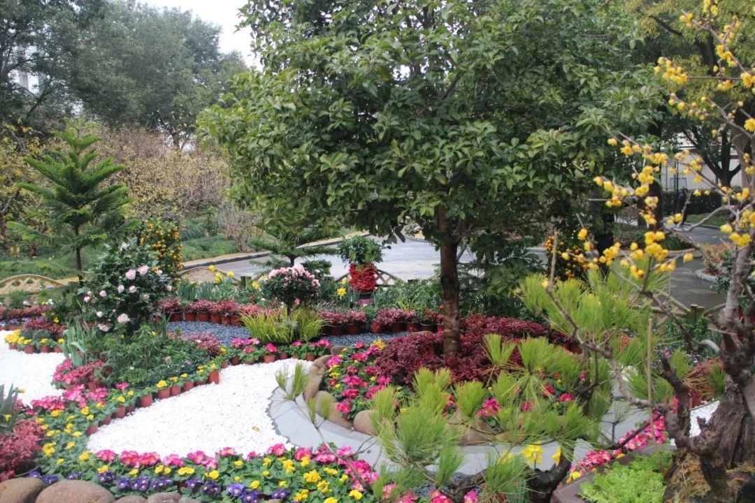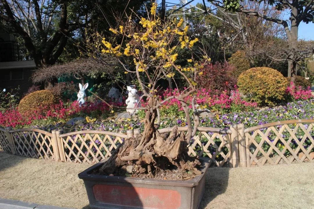 入目便是各式的造型蜡梅盆景,悄然绽放,傲然挺立,在寒风中展现自己最美的姿态。由郁金香与五色报春花组成的花坛,象征着祝福和希望。