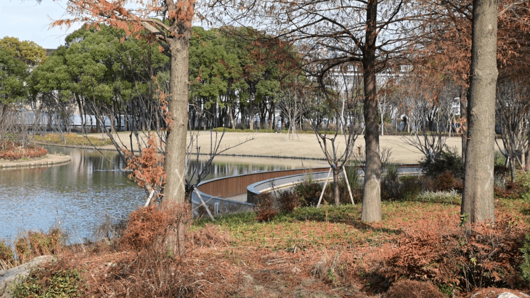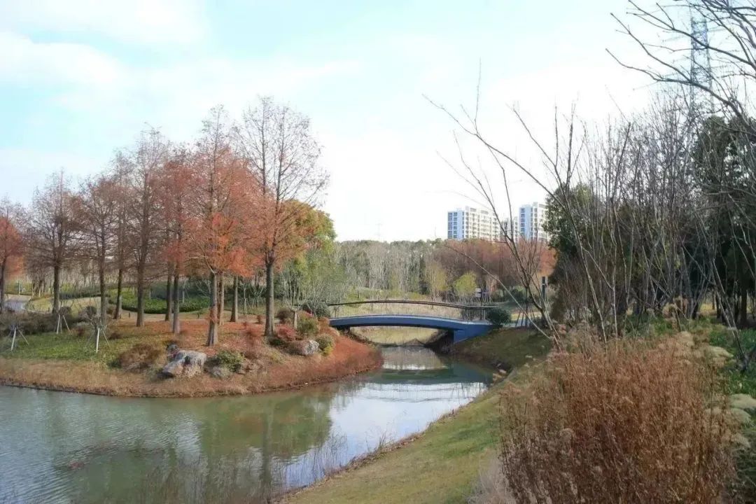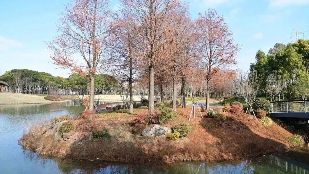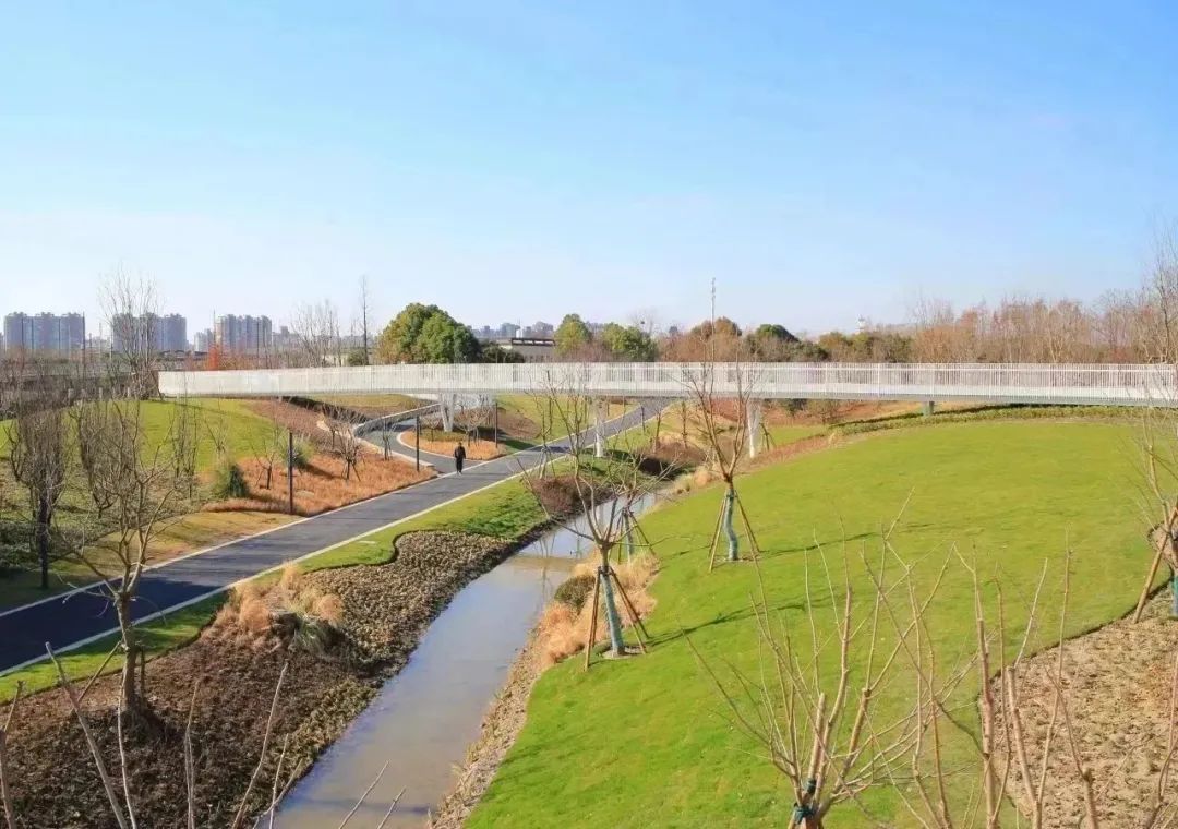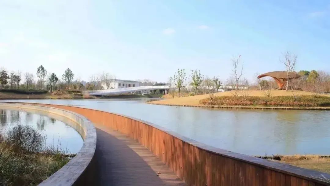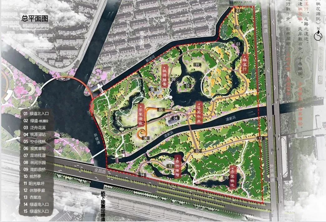 公园以“城郊十里,林枕花溪,桃花岛上,鹭临江南”为设计主题。通过梳理园内水系,使得湖面、水道和湿地、林地紧密结合。优化环城公园带绿道,串联园内主要景观节点。
