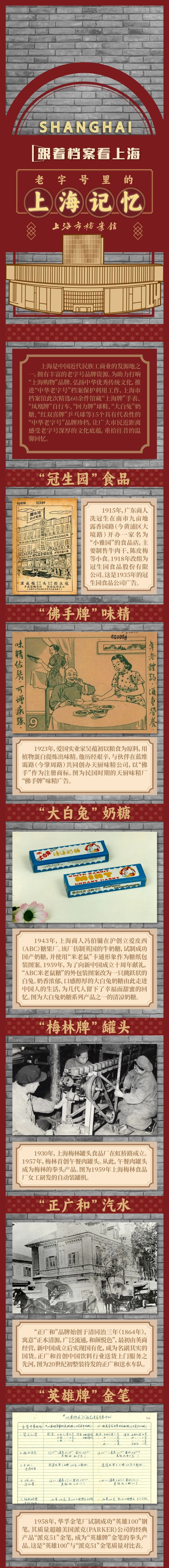 冠生园、佛手、梅林、大白兔......在这些老字号、老品牌背后,有着怎样的独特记忆与时光故事?近日,“老字号里的上海记忆”展亮相上海地铁龙阳路站“跟着档案看上海”时光走廊,通过一系列珍贵档案史料的精彩呈现,吸引往来市民驻足停留,近距离感受老字号所蕴含的历史魅力,感悟一个个金字招牌背后的匠心、坚守与传承。